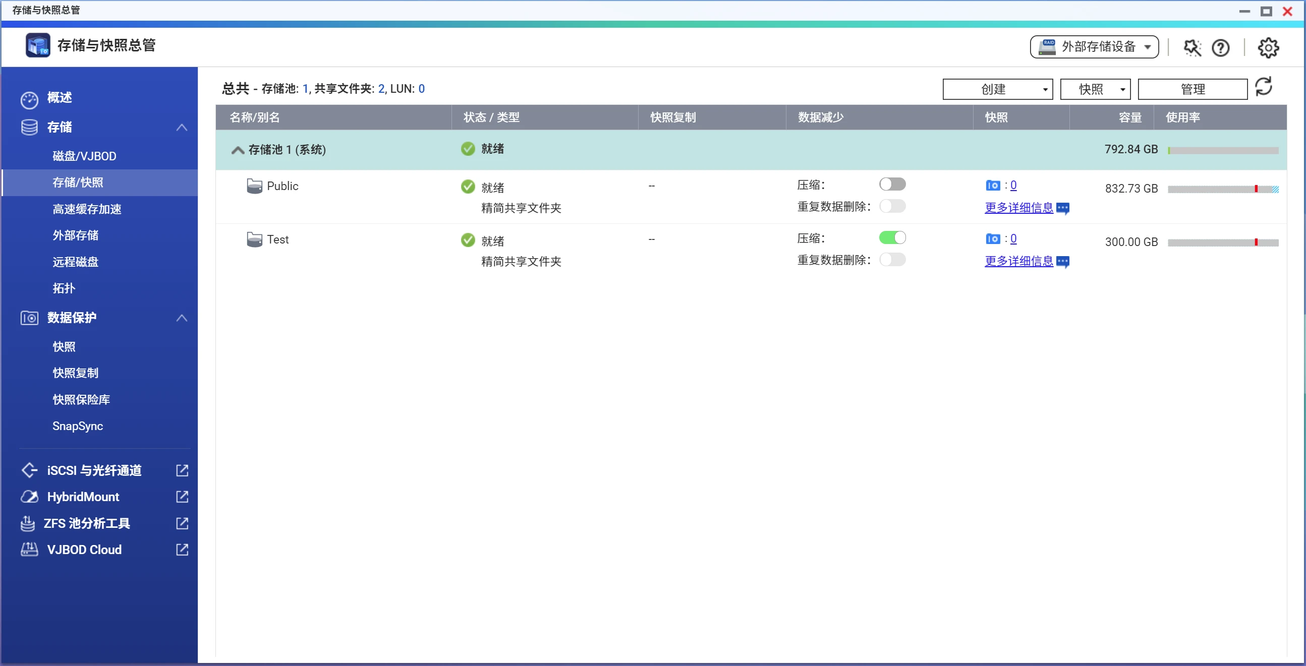 快照功能一直是威联通的杀手锏,威联通快照为数据提供区块链保护。快照可以记录厚卷、精简卷或区块 iSCSI LUN 在特定时间点的状态。意外删除或修改快照中的数据时,可将其迅速恢复至该状态。
