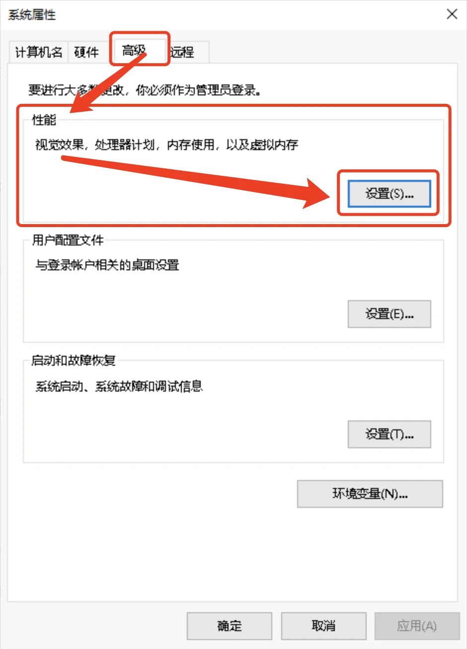 性能选项弹窗:先应用,再确定!系统属性弹窗:确定。