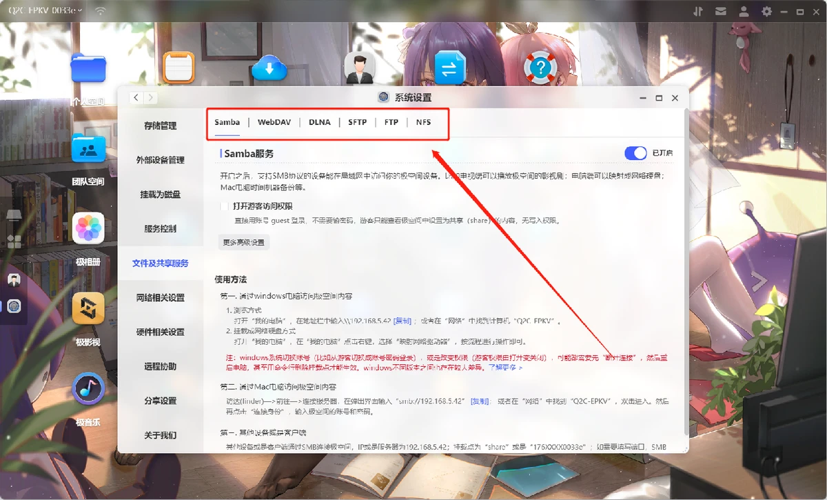 极空间系统做得非常好的是,各种协议都支持的极为齐全,这点已经赶超传统NAS厂商群晖、威联通了!