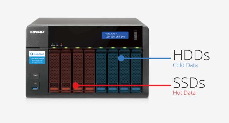 QNAP Qtier 技术是威联通独有的实现自动分层存储解决方案,它也是目前最优秀的 SSD 与 HDD 应用组合方案,可识别数据的存取频率,自动将频繁存取的「热」数据移动到性能较高的磁盘层,而将较少存取的「冷」数据移动到成本低、大容量的磁盘层,让企业享有性能与成本 (TCO) 兼顾的存储服务。