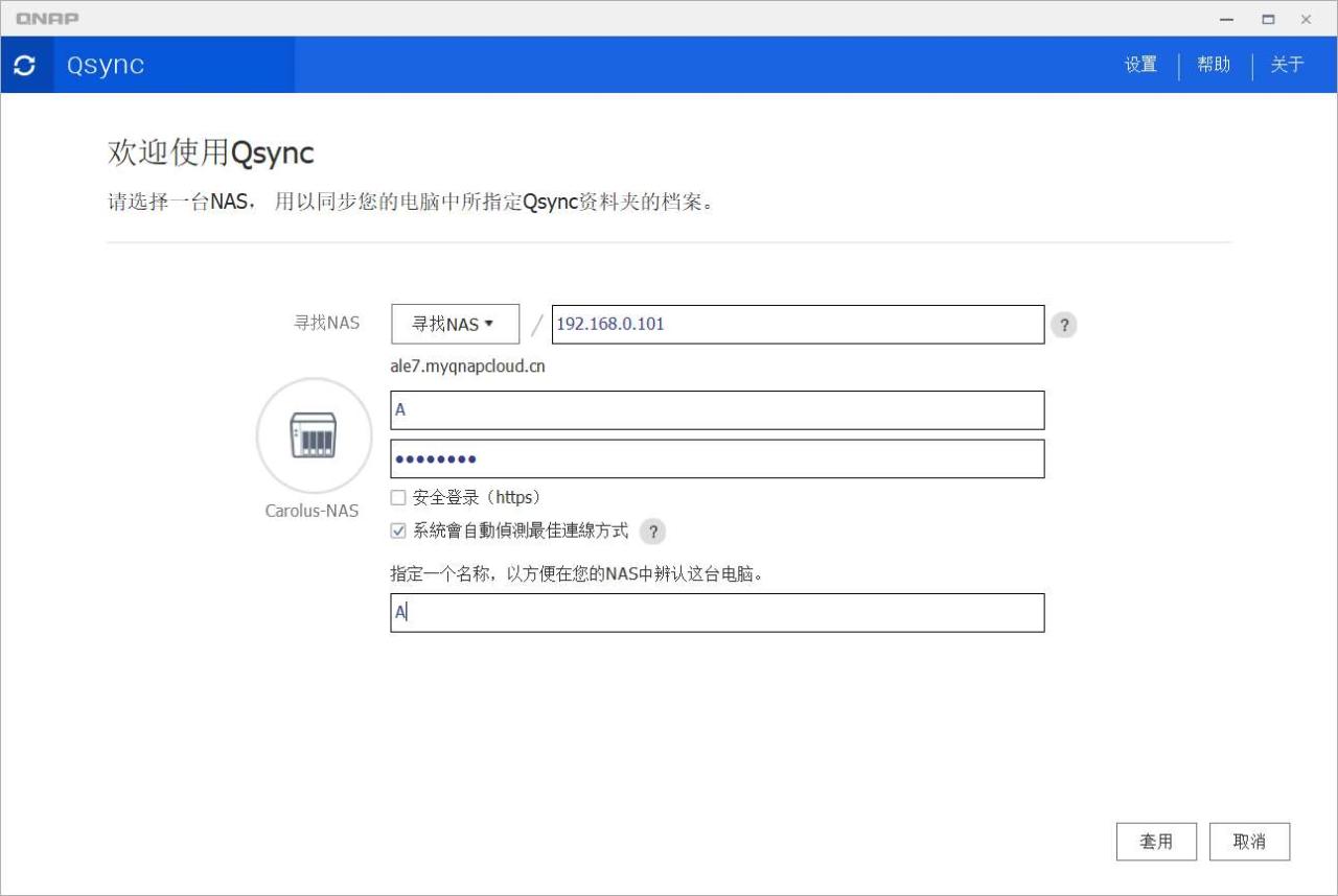 下载完成进入。直接点击寻找 NAS,在局域网内或者外网,然后输入我们的账号。最后点击套用即可。