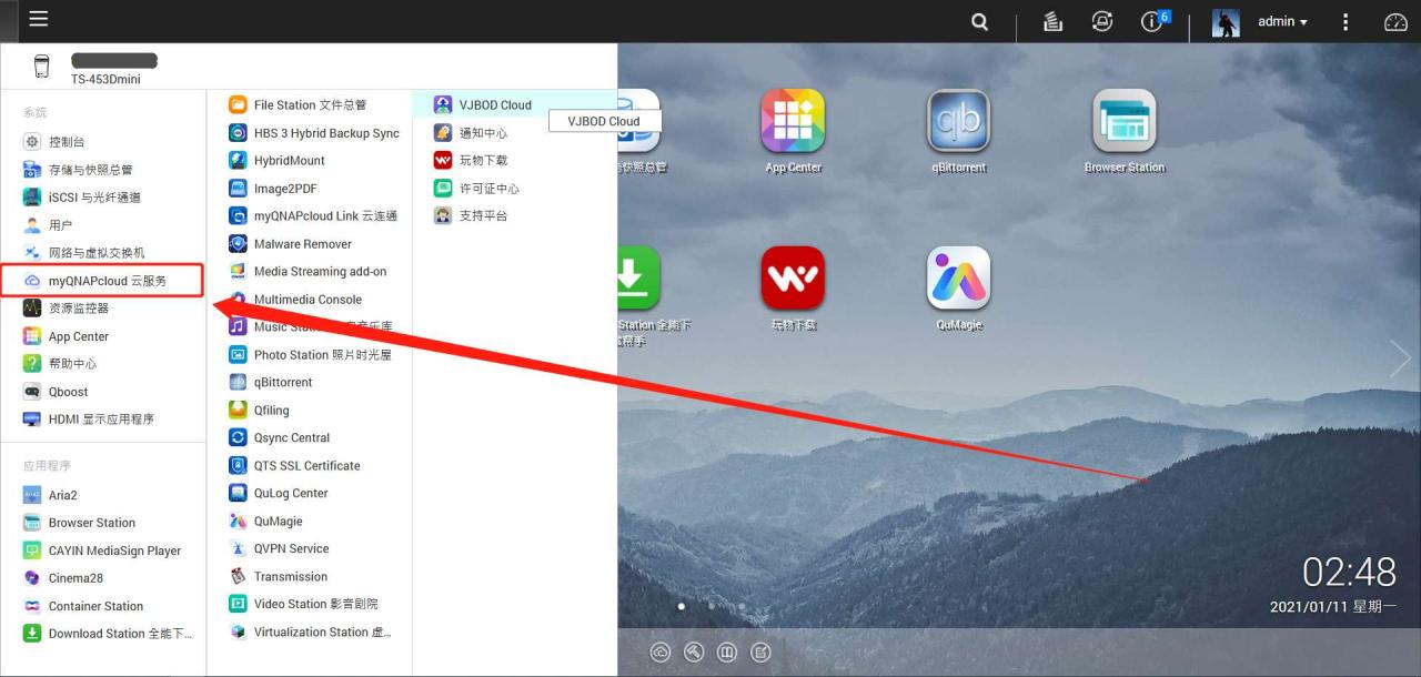 首先,咱们点击 QTS 系统左上角“三”字符号,打开 APP 全目录,找到“myQNAPcloud 云服务”。