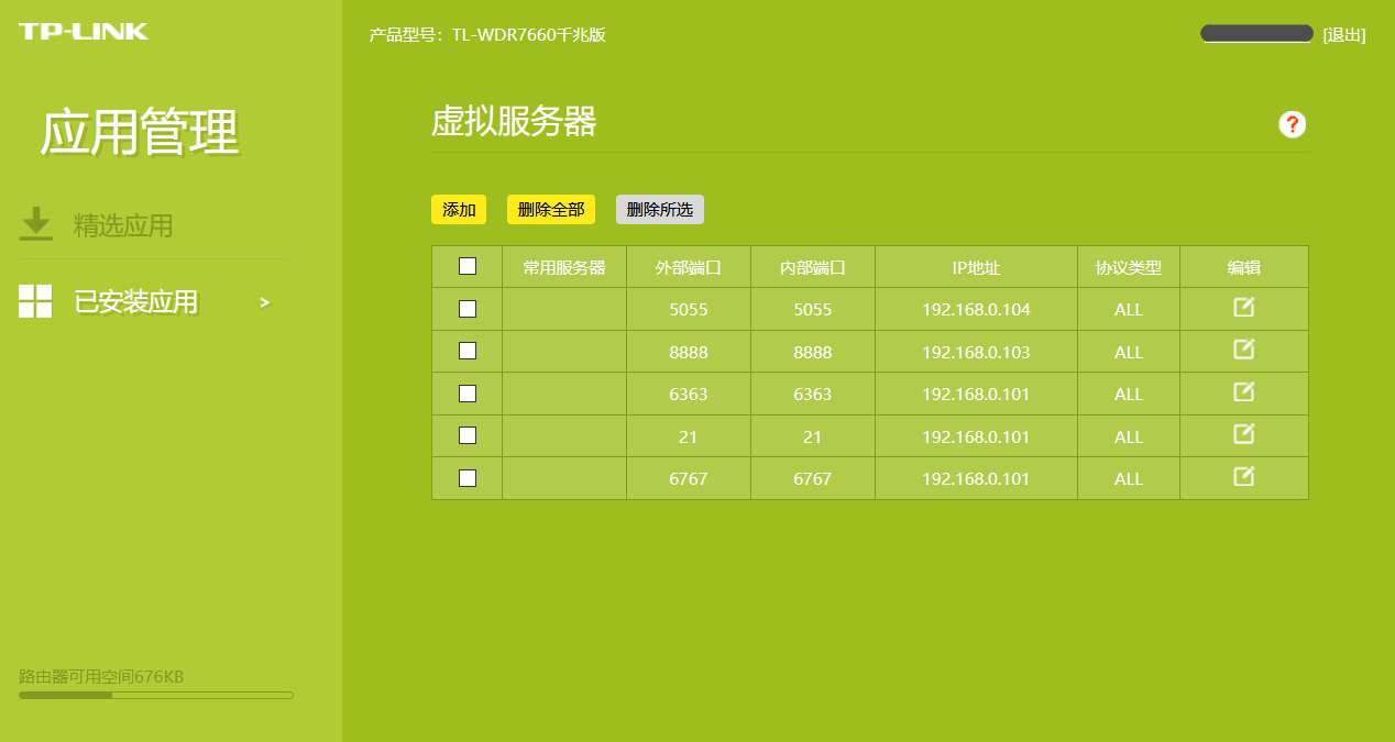 其中内部端口和外部端口要保持一直,这个是 NAS 的端口地址,咱们可以随便设置:如 8888,6666,6789 之类均可。服务器 IP 地址是 NAS 的地址。注意需要错开一些服务用端口:比如 8096、8089、443、8080 等。