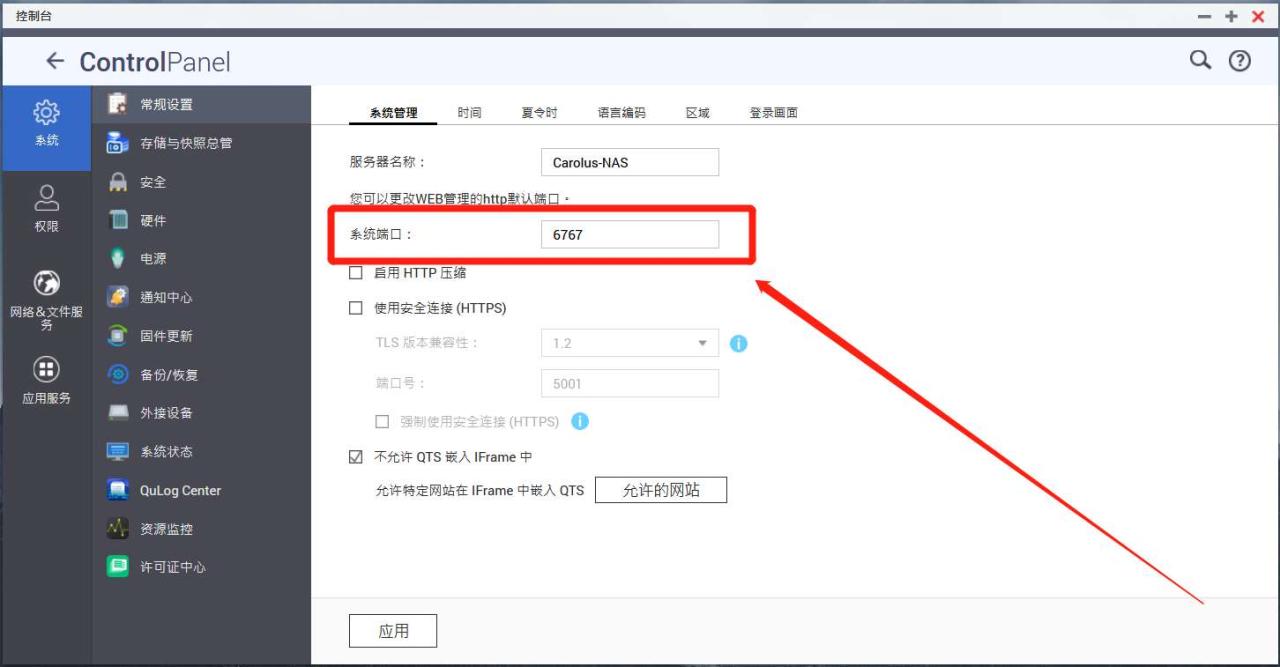 NAS 端口设置在“控制台”,“常规设置”里面。