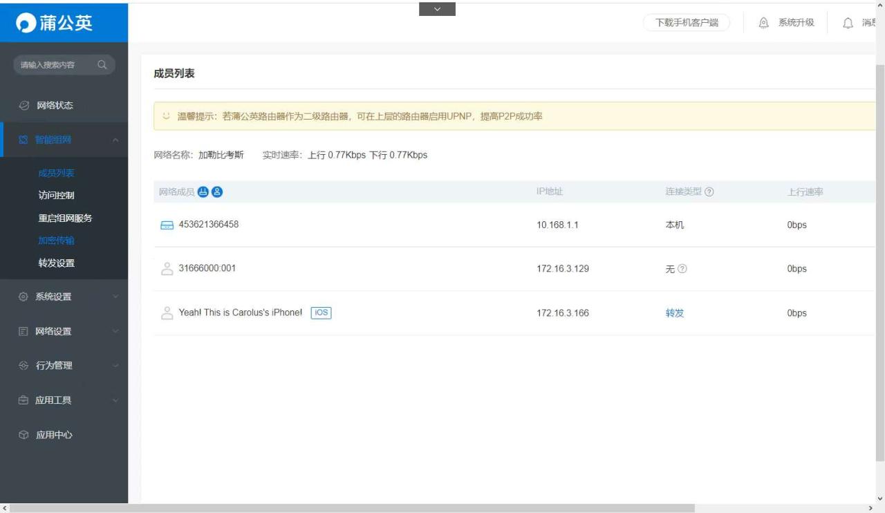 需要注意的是,如果是走的 p2p 模式,是不限流量不限带宽的,但是有一些复杂网络状态下(比如跨运营商、多层网络)可能 P2P 模式无法成功,这时候就需要使用服务器转发了,蒲公英 X1 提供最低 2Mbps 的速度,专业版 78 块钱一年一台设备,传输速度是 4Mbps,这个速度用来传输小文件是可以的,而且蒲公英这个非常稳定!