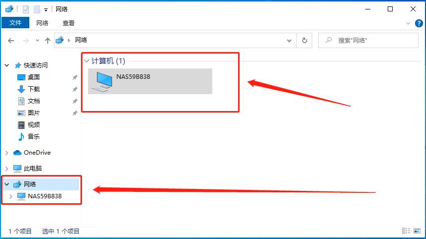 首先需要注意的是,电脑要和 NAS 处于同一个局域网。打开“我的电脑”,然后点击“网络”,可以看到“计算机”里面有一个设备名称“NAS59B838”这就是咱们局域网内的 NAS。