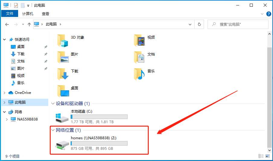 然后返回“我的电脑”,就可以看到“网络位置”多了一个卷,这个卷就是 NAS 里面的文件夹,它平时表现就和本地的卷一样,可以随意使用。