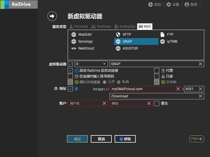 首先,在 RaiDrive 官网直接下载工具,然后打开。选择“添加”,服务类型选择“NAS”。这时候咱们可以看到有 QNAP,直接选择即可。