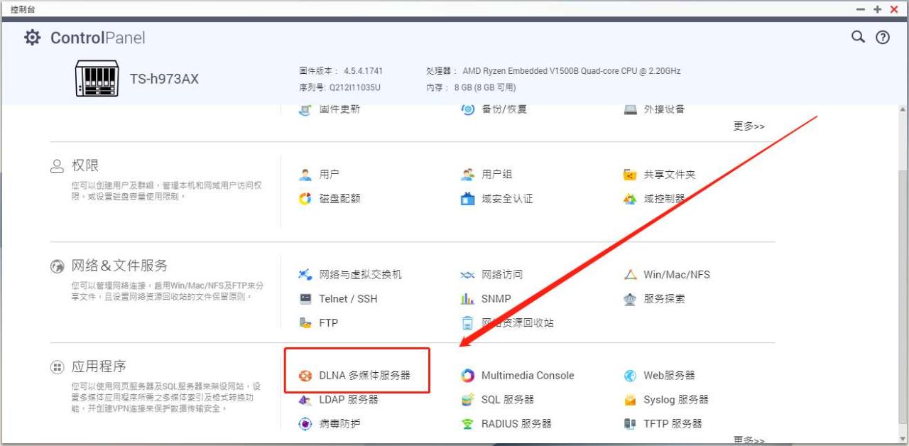 首先,我们进行威联通 QTS 系统,打开“控制台”,选择“应用程序”里面的“DLNA 多媒体服务器”并打开。