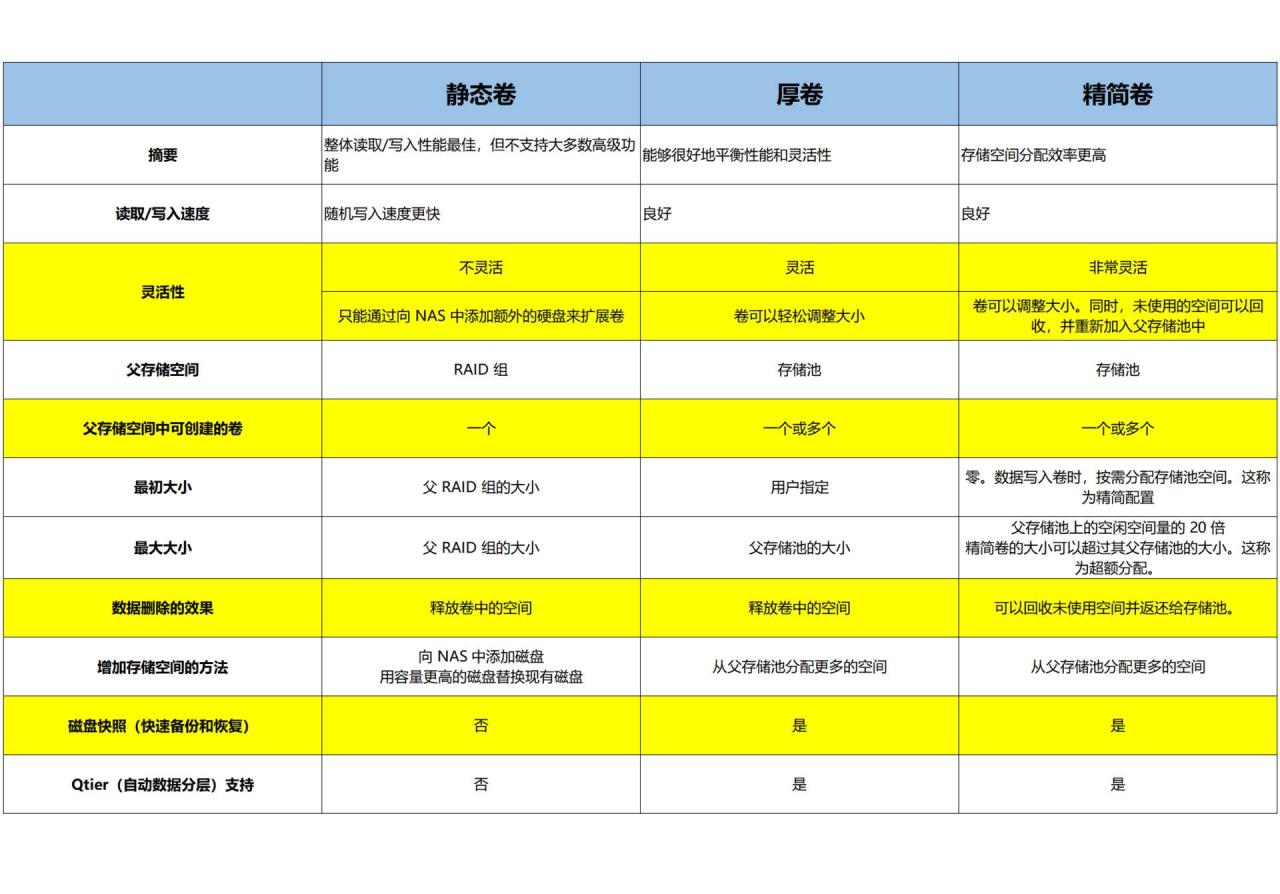 一般而言,建立完存储池后就需要在上面建卷,咱们以威联通的 NAS 系统为例,在存储池上又提供厚卷、精简卷 2 种卷形式。请注意,静态卷由于不具备存储池的属性(快照、Qtier、版本控制),所以这个是单独另外建立的,它与存储池层级并列,且建立好就可使用。
