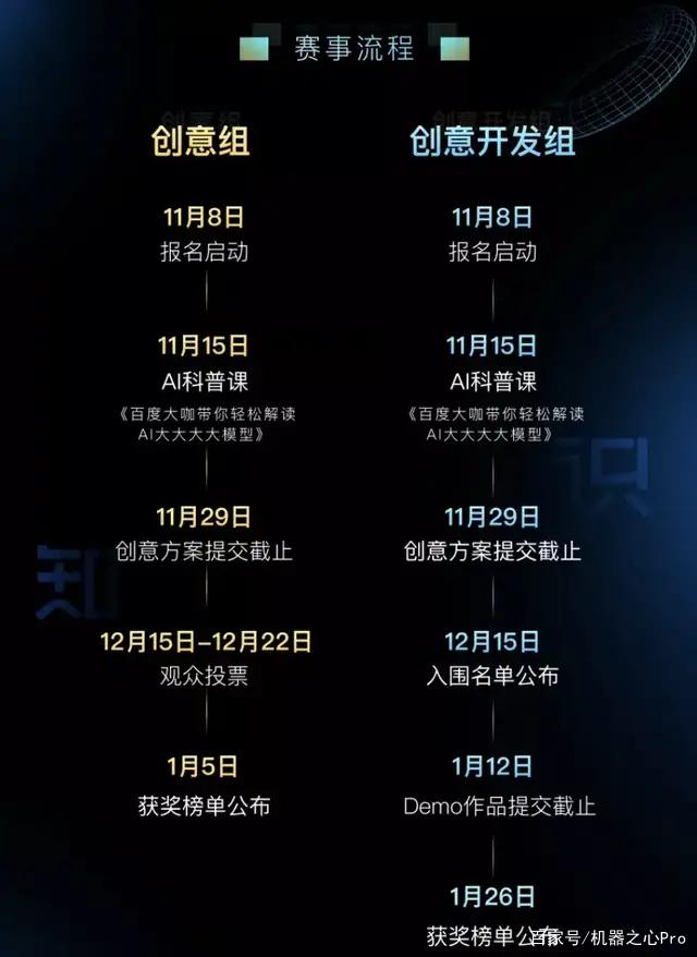 参赛选手不仅能近距离接触大模型,还有机会获得重磅奖励。“创意组”、“创意开发组”都将有机会获得百度的荣誉认证与丰厚的奖金,第一名高达 3 万元。优秀的作品还有机会在线下展出、获得创投资源支持,让更多的人看见你的 AI 创造力。