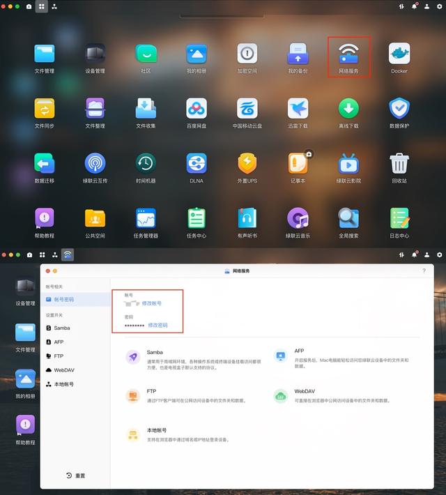 首先我们先要注册一个本地账号,这个我们拿到机器后就可以先提前设置好。打开绿联云APP主界面,点击【网络服务】-【账号密码】,先设置好自己的本地账号和密码。