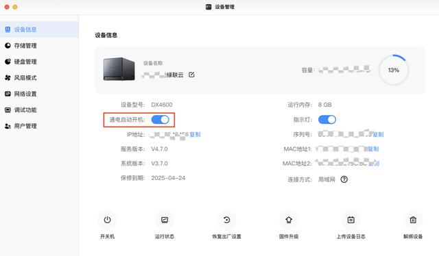 如果没有UPS设备的小伙伴们,可以正常在【设备管理】中,打开【通电自动开机】按钮,来保证来电通网后继续正常使用。