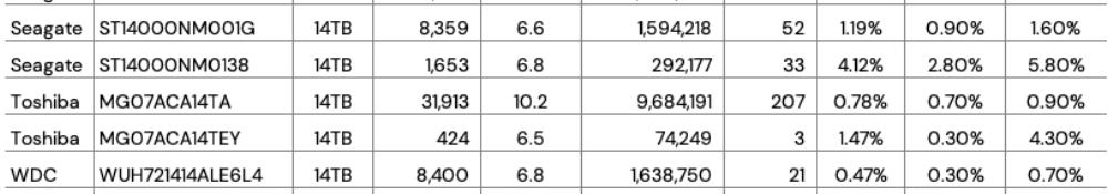 从backblaze报告来看,14TB容量的硬盘已经真正规模使用:希捷的ST14000NM001G、ST14000NM0138;东芝的MG07ACA14TA、 MG07ACA14TEY;西数的 UH721414ALE6L4合计有5万7百4十9块在营,其中仅东芝的MG07ACA14TA就有3万1千9百1十3块,是Backblaze目前在营数量最多的单一型号!