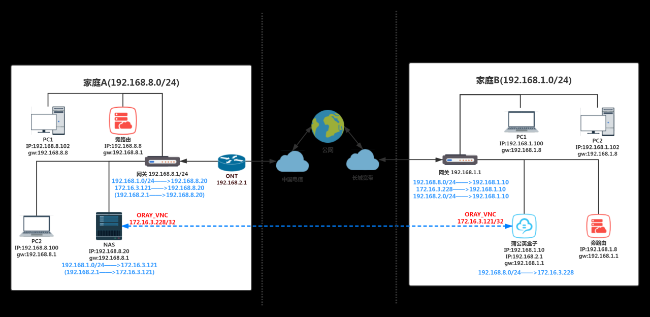 隧道的两端,分别为家庭A的NAS服务器和家庭B的蒲公英盒子(本质上就是两个旁路由)。