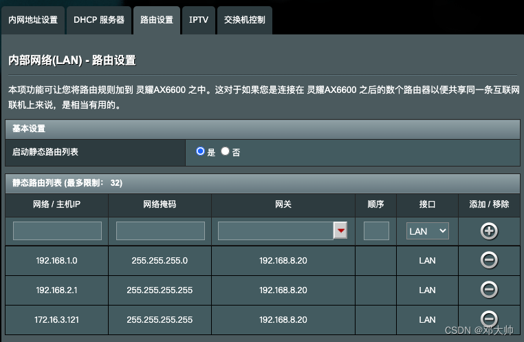 当家庭A网段(192.158.8.0/24)中任何一个设备要访问家庭B网段(192.168.1.0/24)内的设备,以及家庭B端的局域网隧道端口——即蒲公英盒子(172.16.3.121/32),都需要经过NAS服务器(192.168.8.20)上的隧道出去,那么首先就要让家庭A中的任何一个设备在想要访问家庭B时,能够找到家庭A中的NAS服务器这个’大门’。因此需要配置家庭A中的默认网关(192.168.8.1/24)的路由表,将所有请求家庭B网段(192.168.1.0/24)的地址以及家庭B端的局域网隧道端口(172.16.3.121/32),指向本地的NAS服务器(192.168.8.20)。