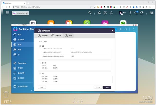 1.先下载Halo镜像,打开Container Station 容器工作站,点击【容器】选项,然后【创建】一个容器