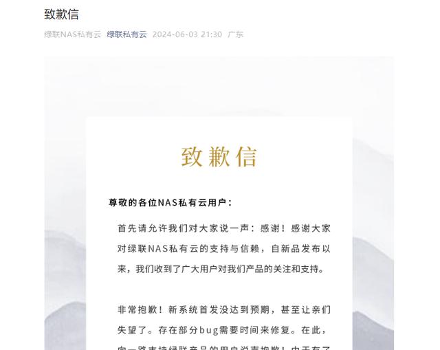 此外,更让用户难以接受的是绿联的致歉信,明明很多问题还没有解决,绿联却仍然在给用户画饼。预计能够给到更好的体验、预计6月底上线、预计更强版本等模糊性用语让不少用户提出疑问,问题到底有没有解决?怎么解决?