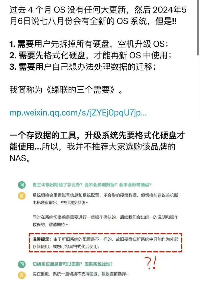 首先,新系统的升级过程就是用户的一大挑战。升级步骤的繁琐和缺乏明确指引,使得许多用户在操作过程中感到困惑。更令人难以接受的是,升级过程中需要对硬盘进行格式化,这不仅意味着用户必须放弃宝贵的数据,还可能面临数据迁移的繁琐工作。这种升级方式无疑增加了用户的使用成本和门槛,也让用户对新系统的接受度和信任度大打折扣。NAS系统的价值在于其稳定性和可靠性,而新系统的升级过程却让用户对这些核心价值产生了怀疑。