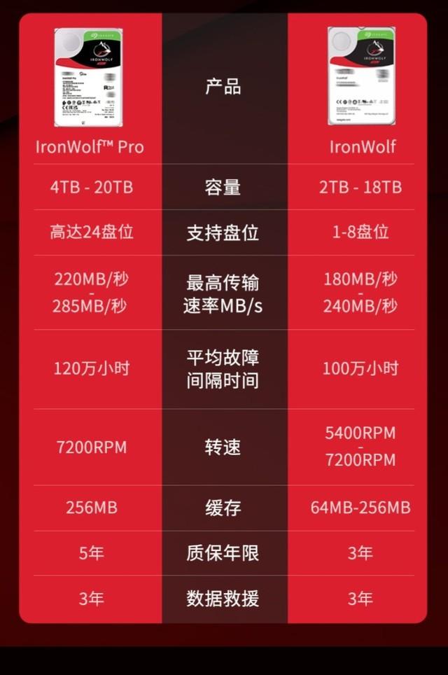 通过商品页面可以看到,在诸如CMR技术,AgileArray智能阵列技术和内置旋转振动(RV)传感器等方面两个系列是相同的,主要区别在于酷狼Pro系列全系采用256MB缓存,转速为7200RPM,因此最高传输速率也比普通酷狼系列快了许多,并且官方的质保年限也来到了5年。