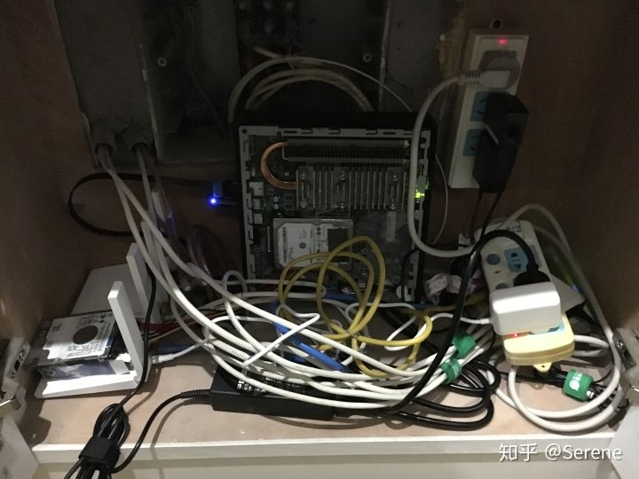 我是这样放进弱电箱的(一块硬盘在机箱内,另一块在左边路由器上放着):