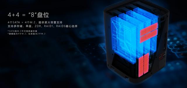除了CPU性能上的升级,极空间也充分考虑到了用户的数据量增长需求,提供了划时代的8盘位设计。其中有4个SATA接口(SATA 3 6Gbps,支持2.5/3.5英寸硬盘,最大支持单盘22T/7200转)、4个M.2接口(16GT/s,M.2 NVMe 2280)超强拓展功能。可以根据自己的需求以及硬盘数组建不同的RAID模组,并且插在M.2接口的SSD同样支持外挂。另外,Z423有2个内存插槽,预装32GB内存,不仅满足大多数用户的使用需求,而且支持更换和扩展。而绿联DX4600pro依旧是四盘位设计,接口上比没有极空间Z423丰富。