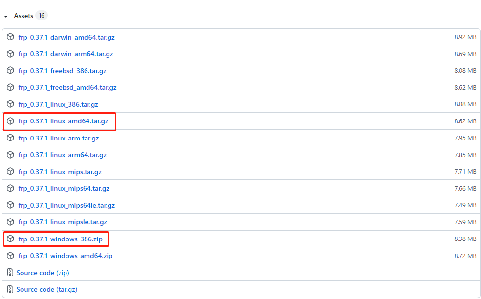 接下来详细介绍FRP,什么是FRP呢?Fast Reverse Proxy(FRP)是一种高性能的反向代理技术,能够使内网的机器对外网环境提供 http 或 https 服务。具体如何实现呢?首先你需要有两台机器,一台位于外网环境(云服务器或具有公网IP的机器)和一台处于内网环境(局域网)中的机器。本文以腾讯云Win10服务器(外网)和猫盘Plus刷的黑群晖(内网)为例,介绍FRP的具体实现步骤。首先在两台机器上根据操作系统和架构分别下载对应的压缩包,下载地址:GitHub地址