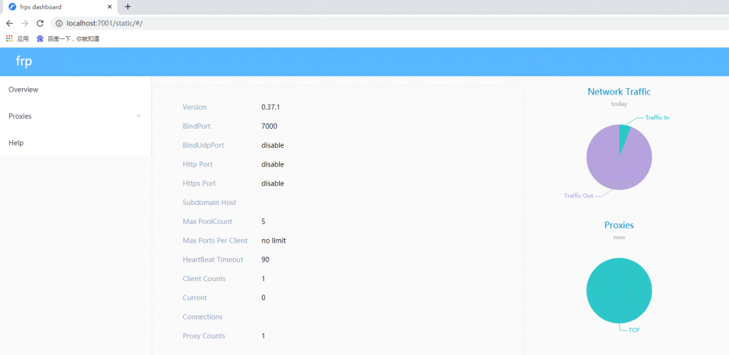 4. 成功连接后可以在外网服务器端查看连接状态,也可登录FRP的dashboard页面查看连接状态。