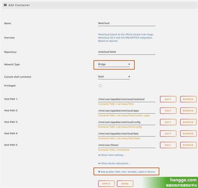 (2)接着会进入到容器的设置页面,我们将网络类型设置成 Bridge,然后点击页面下方的“Add another Path, Port, Variable, Label or Device”按钮添加端口映射。