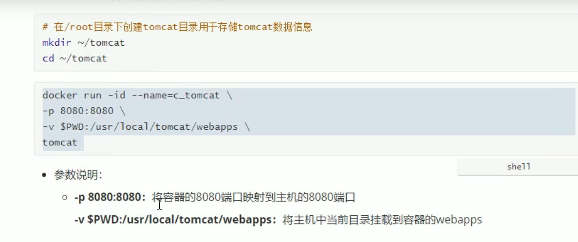 mkdir ~/tomcat cd ~/tomcat docker run -id --name=c_tomcat -p 8080:8080 -v $PWD:/usr/local/tomcat/webapps tomcat