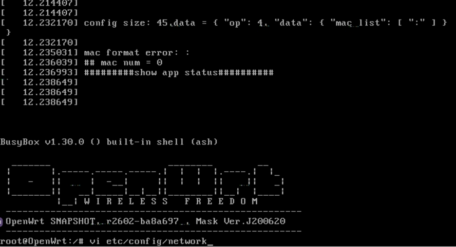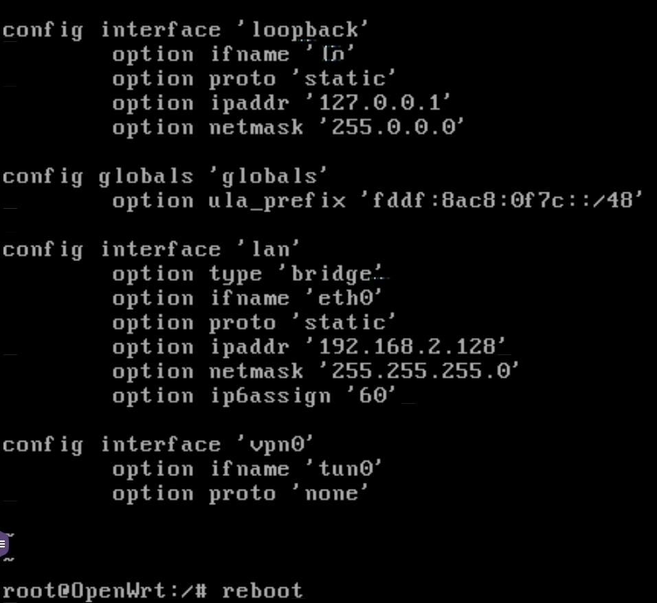 root@OpenWrt:~# vi /etc/config/networkconfig interface 'loopback' option ifname 'lo' option proto 'static' option ipaddr '127.0.0.1' option netmask '255.0.0.0'config globals 'globals' option packet_steering '1'config interface 'lan' option type 'bridge' option proto 'static' option ipaddr '192.168.1.1' option netmask '255.255.255.0' option ip6assign '60' option _orig_ifname 'eth0' option _orig_bridge 'true' option ifname 'eth0 eth1 eth2'config interface 'wan' option proto 'dhcp' option ifname 'eth3'