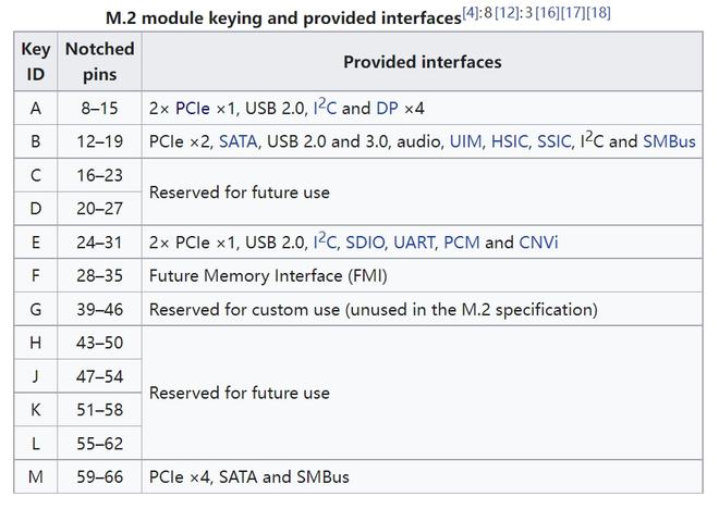 不同 M.2 KEY 的用途,图片来源:维基百科
