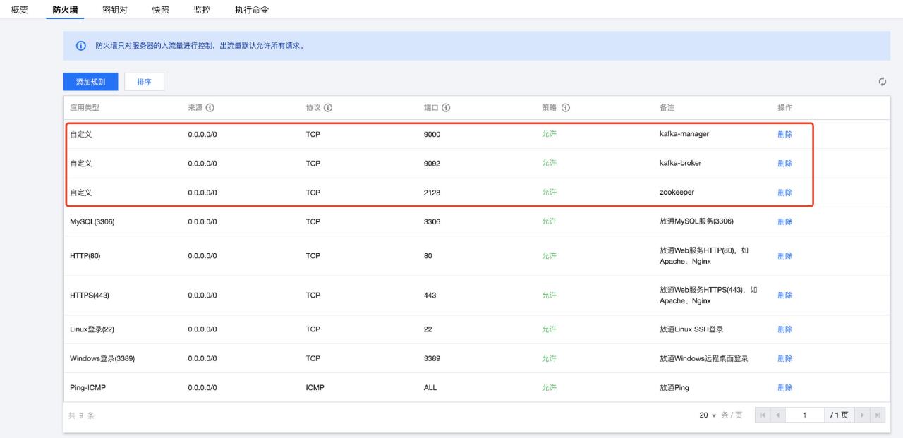 3.如果你用的是云服务器,那需要把端口给打开,2181,9000和9092