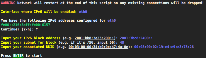 wget https://github.com/Aniverse/inexistence/raw/master/00.Installation/script/ipv6 bash ipv6 [address] [subnet] [DUID] [interface] bash ipv6 2001:3bc8:2490:: 48 00:03:00:02:19:c4:c9:e3:75:26 enp2s0 bash ipv6 [address] [subnet] [DUID] bash ipv6 2001:cb6:2521:240:: 57 00:03:00:01:d3:3a:15:b4:43:ad