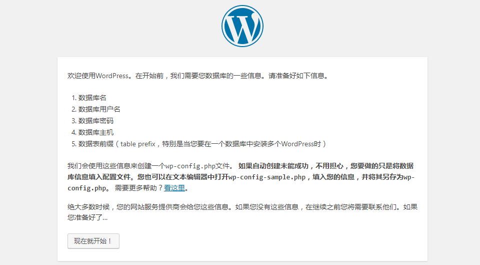 3.选择语言后,进入 WordPress 安装要求说明,点击“现在就开始”进入下一步