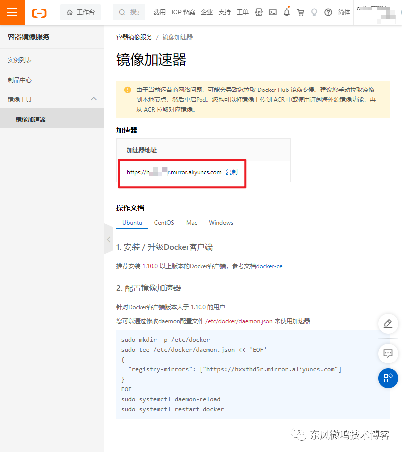 阿里云加速器(点击管理控制台 -> 登录账号 -> 右侧镜像工具 -> 镜像加速器 -> 复制加速器地址)[3]