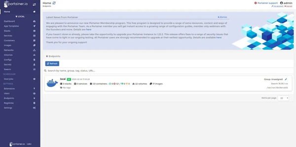 $ docker volume create portainer_data $ docker run --name portainer -d -p 8000:8000 -p 9000:9000 -v /var/run/docker.sock:/var/run/docker.sock -v portainer_data:/data portainer/portainer