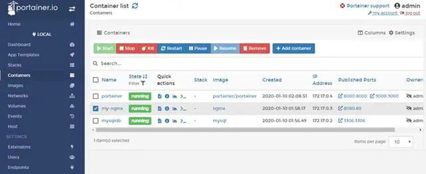 之后就可以看到本机上运行的 Docker 容器了,点击它们还可以进行容器的管理。左边的条目可以管理卷、创建容器、查看主机信息等等。基本上该有的功能都有了,这也是我推荐的一个工具。