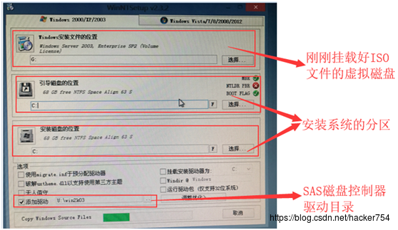 3.进入PE——加载ISO镜像到虚拟磁盘——使用WinNTSetup进行安装系统(‘加载驱动’选项选择SAS RAID驱动目录)