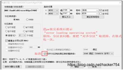 答:PE下使用DiskGenius在格式化C盘,不要勾选‘对齐分区到此扇区数的整数倍’