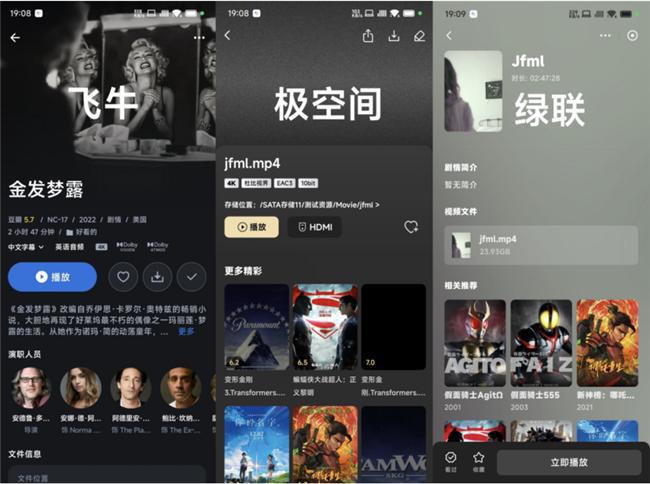 最后再来看看绿联的影视中心手机端的界面设计,整体跟客户端、网页端也是大差不差。主要区别在于详情页会更加「精简」,毕竟手机屏幕本身就比较小,整体体验会更友好。