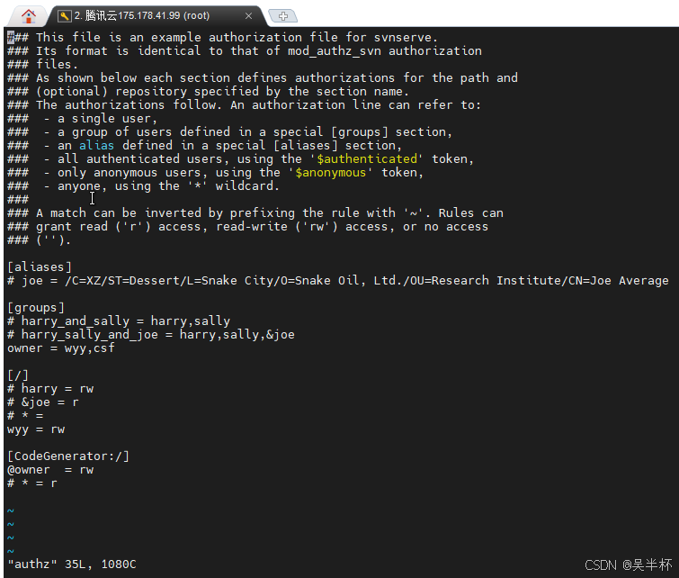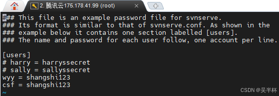 [svn:/] # 表示以下用户在仓库 svn 的所有目录有相应权限