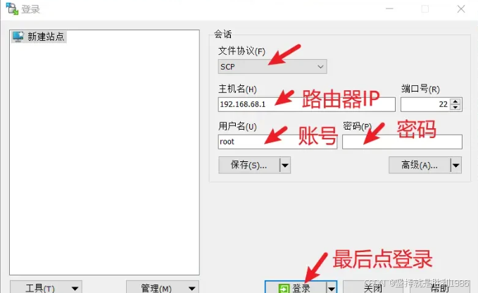 在电脑(电脑网络接入该路由器)上打开winscp软件,输入路由器的IP 账号密码完成登录