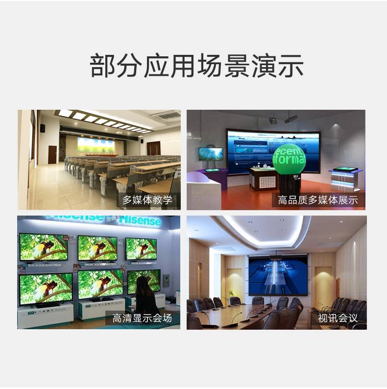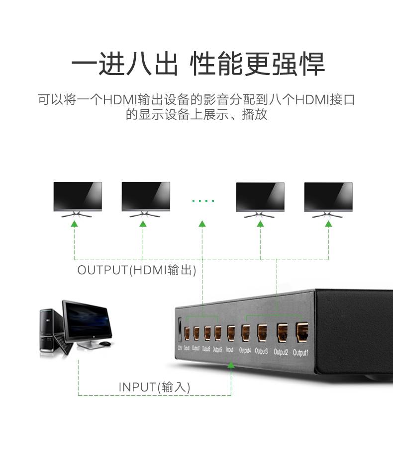 可以将一个HDMI输出设备的影音分配到八个HDMI接口的显示设备上展示播放。