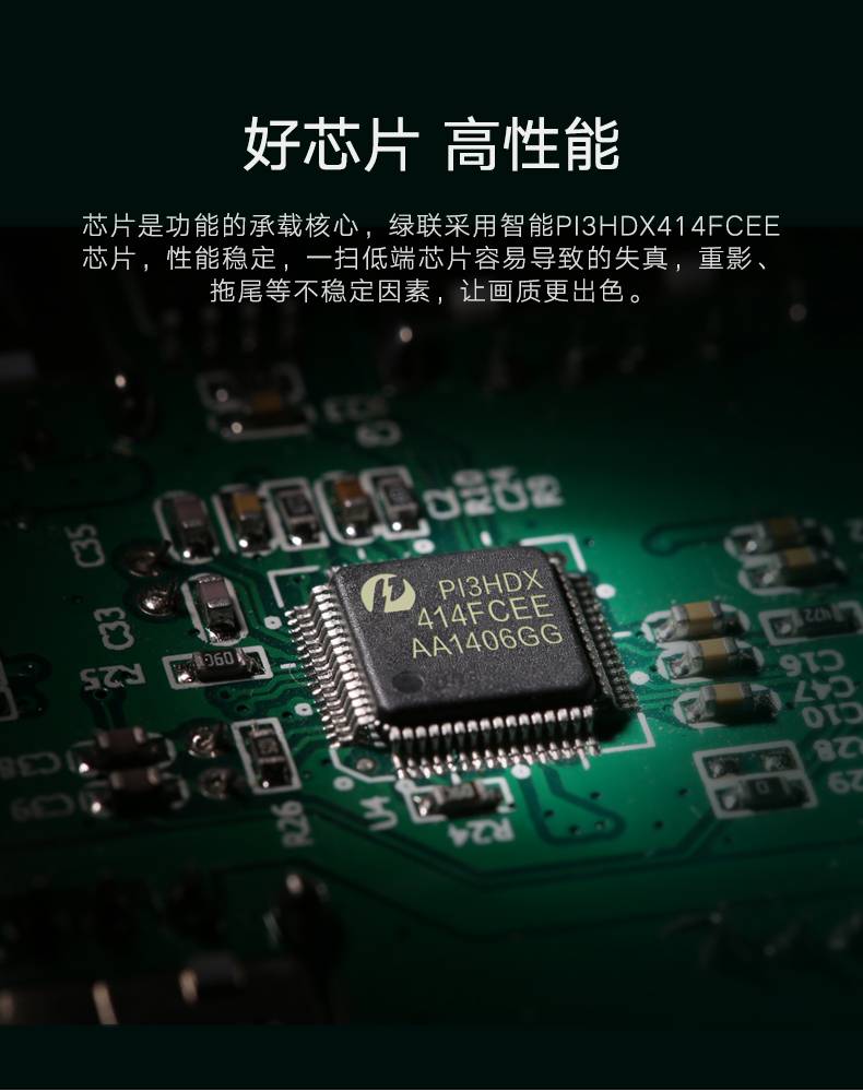 芯片是功能的承载核心,绿联采用智能PI3HDX414FCEE芯片,性能稳定,让画质更出色。