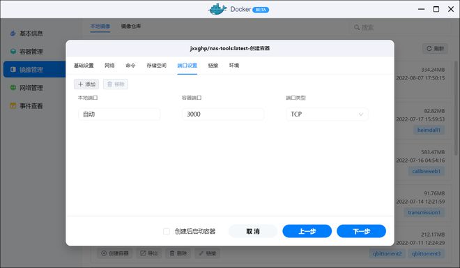 同时还要把端口映射出来,容器端口为3000,本地端口可以自动。