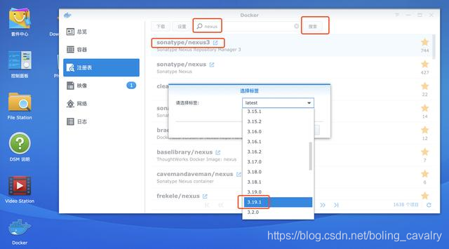 打开Docker,在注册表页面搜索nexus,找到sonatype/nexus3,选择标签3.19.1,如下图: