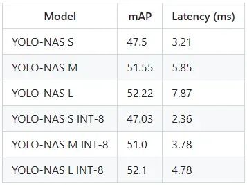 YOLO-NAS已发布了三个不同版本,即小型、中型和大型,分为量化和非量化两种情况。明显可以看到,在应用量化时map值略有下降。