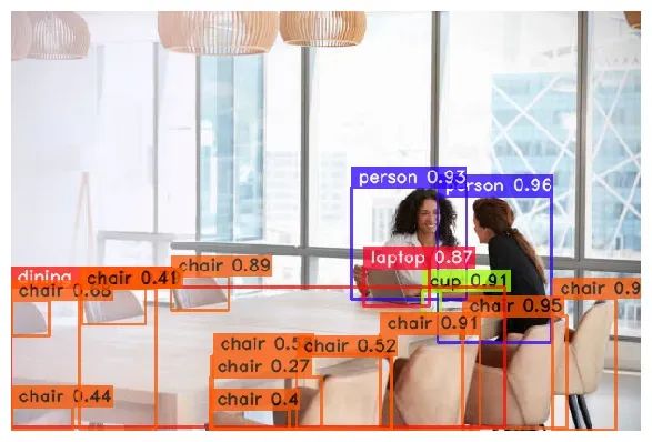 正如您在结果图片中看到的那样,所有的椅子都被检测到。桌子上的小物体,如杯子和笔记本电脑,也被检测到了。