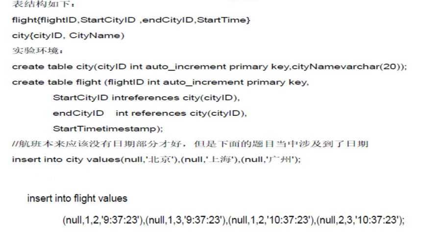 select * from flight f,city c where f.endcityid =c.cityid and startcityid = (select c1.cityidfrom city c1 where c1.cityname = "北京") order by c.citynameasc; select flight.flightid,'北京' startcity, e.cityname from flight,city e where flight.endcityid=e.cityid and flight.startcityid=( selectcityid from city where cityname='北京'); select flight.flightid,s.cityname,e.cityname from flight,city s,city e where flight.startcityid=s.cityid and s.cityname='北京' andflight.endCityId=e.cit yID order by e.cityName desc;